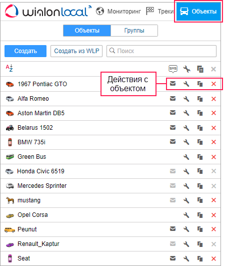 На вкладке Объекты создаются объекты и группы объектов, за которыми впоследствии можно следить на вкладке Мониторинг. На вкладке работает динамический поиск по имени объекта. Также здесь можно выполнять следующие действия с объектами: отправка SMS, редактирование свойств, копирование и удаление.