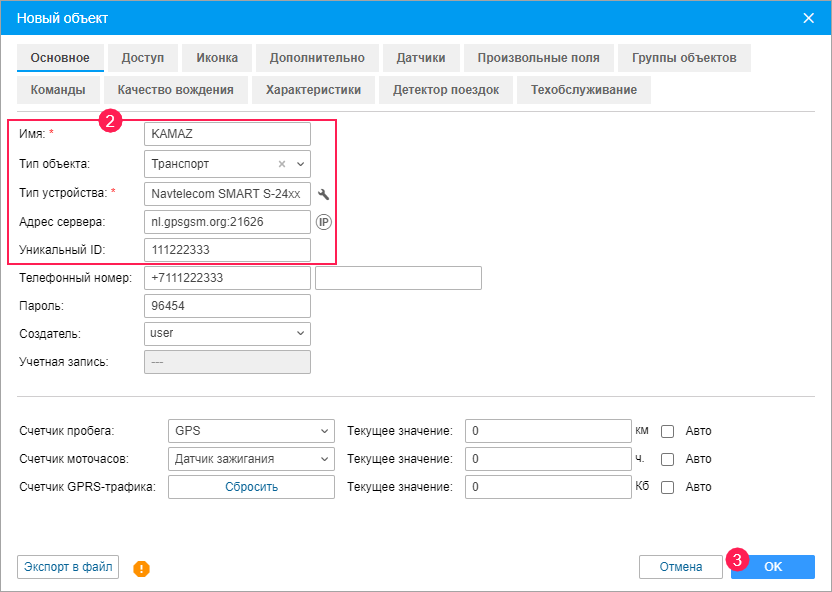 2. Укажите свойства объекта. Для подключения объекта к системе необходимо заполнить как минимум следующие поля на вкладке Основное: