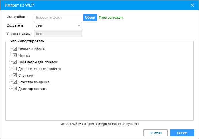 Если у вас есть файл WLP с сохраненными свойствами объекта, то вы можете создать объект с ужé настроенными свойствами. Для этого нажмите на кнопку Создать из WLP, выберите файл и параметры, которые вы хотите добавить в свойства объекта, и нажмите Далее.