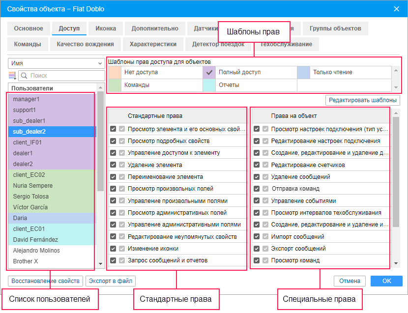 На вкладке Доступ вы можете видеть и изменять права пользователей на объект.