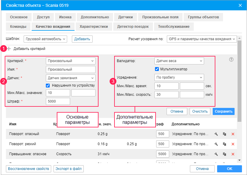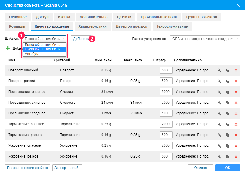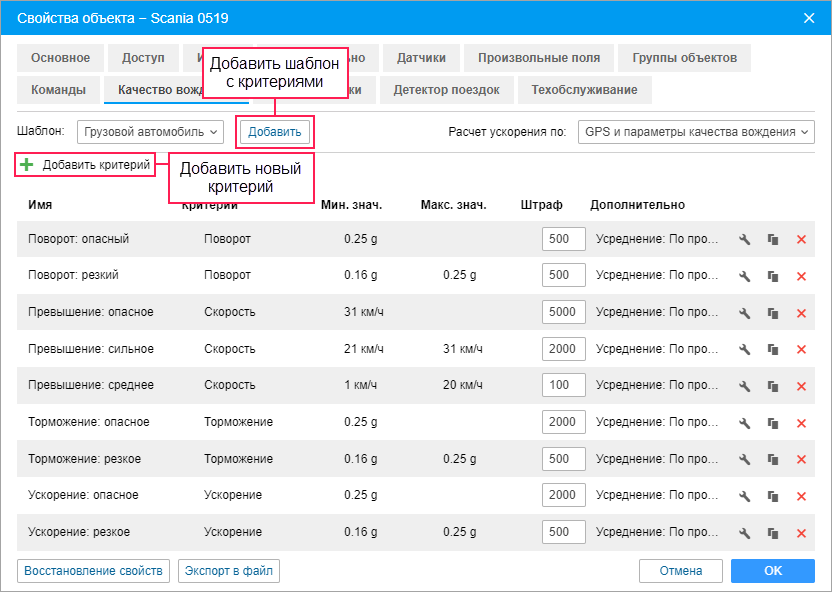 На этой вкладке можно выбрать метод расчета ускорения и добавить критерии, которые позволяют оценить качество вождения водителя и определить нарушения. Это необходимо для того, чтобы повысить безопасность вождения, обеспечить сохранность перевозимого груза и уменьшить расходы на топливо.