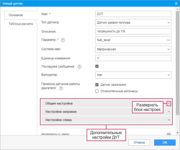 Датчик уровня топлива имеет дополнительные настройки, которые содержатся в трех вложенных блоках: Общие настройки, Настройки заправок, Настройки сливов.