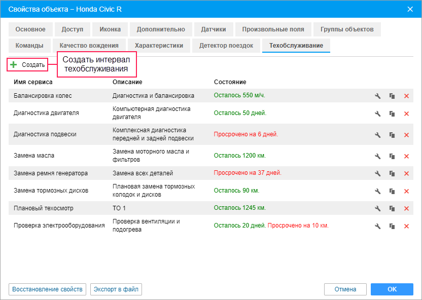 На этой вкладке можно создавать, редактировать и удалять интервалы техобслуживания транспортного средства. Перед началом работы ознакомьтесь с основными понятиями.