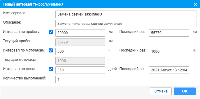 | Интервал по дням | Включите эту опцию и укажите количество дней, через которое необходимо повторно выполнять сервис. В поле Последний раз укажите дату последнего выполнения этого сервиса. |