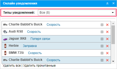 Для пользователей верхнего уровня и пользователей с правами дилера во всплывающем окне онлайн-уведомлений доступен фильтр по типу уведомлений.