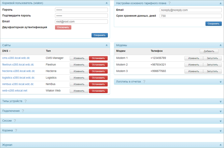 Эта вкладка доступна только при запущенном Wialon Local. Здесь можно настроить сайты и модемы, управлять корзиной и т. д.