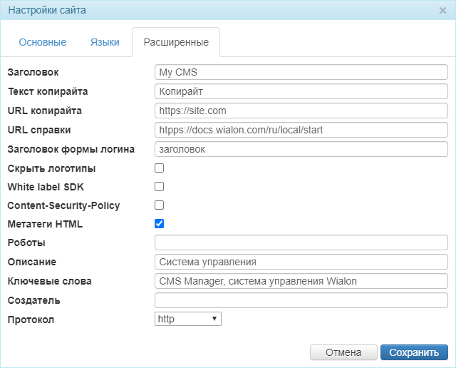 В расширенных настройках сайта CMS Manager доступны описанные ниже параметры.
