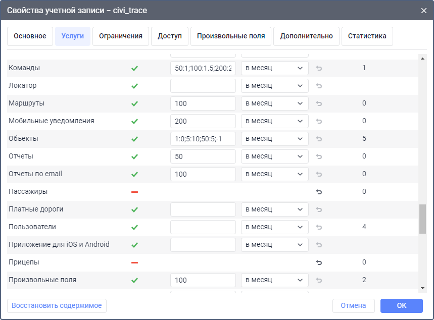 Количество и стоимость | В этом столбце вы можете указать значения количества и стоимости услуги. Например, если для услуги Объекты указано количество 100, то это означает, что в учетной записи нельзя создать более 100 объектов. Эта настройка работает только с некоторыми услугами. Чтобы узнать, с каким услугами она применяется, смотрите их описание. Чтобы указать количество, введите в поле необходимое число. Чтобы указать стоимость, поставьте двоеточие после количества и введите значение стоимости. Например, если для услуги Объекты указать 5:10, то это означает, что пользователь учетной записи может создать 5 объектов по цене 10 у. е. за каждый. Если же указать 1:0;5:10;20:5, то за первый объект плата не взимается, со второго по пятый стоимость объекта составляет 10 у. е., а с шестого по двадцатый — 5 у. е. Чтобы пользователь не мог создать больше 20 объектов, в конце строки необходимо добавить -1, например, 5:10;20:5;-1. Значения количества и стоимости услуги могут быть больше этих значений из свойств тарифного плана, но не больше значений из столбца Лимит. |