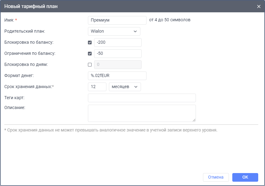 На все учетные записи в системе Wialon назначен какой-либо тарифный план. Он служит для ограничения действий пользователя и тарификации услуг.