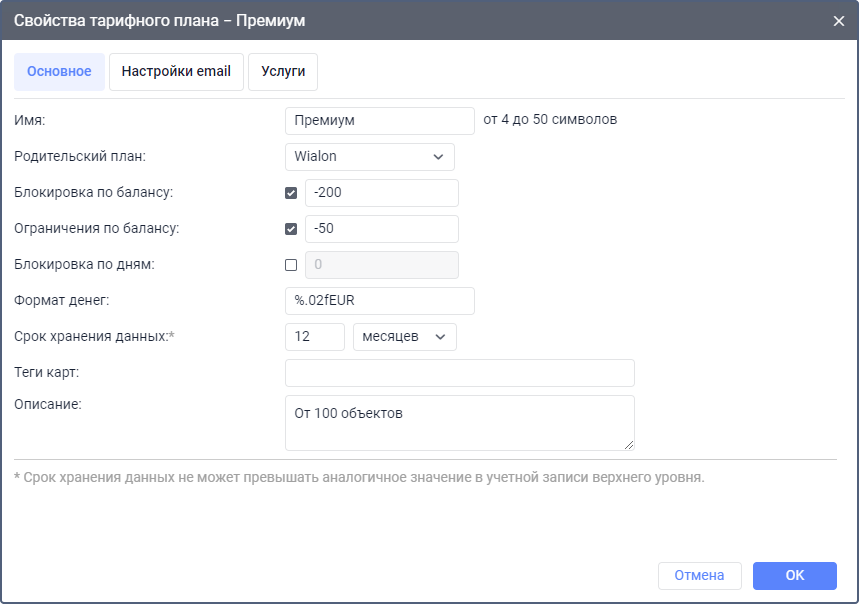 Срок хранения данных | Период времени, в течение которого история объекта (база данных с сообщениями от объекта), логи пользователя, журнал объекта хранятся в системе. Срок хранения данных может быть указан в днях или месяцах (выбрать из выпадающего списка). Все сообщения старше срока хранения автоматически удаляются из базы данных. Это свойство также можно указать для каждой учетной записи индивидуально, но его значение не может быть больше, чем определенное в тарифном плане. |