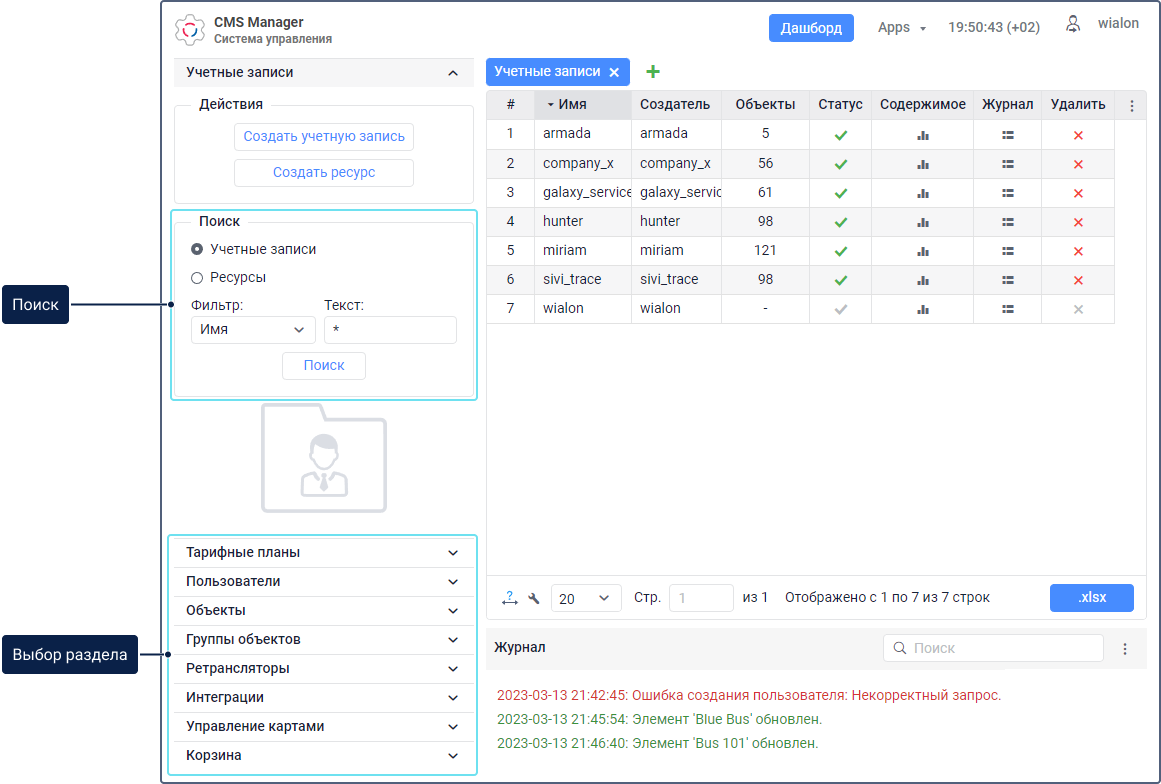Действия | В этой секции находится кнопка(и) для создания элементов системы (учетных записей, пользователей, объектов и т. д.). Для раздела Пользователи здесь также доступна кнопка Менеджер оповещений. |