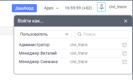 В CMS Manager можно войти в систему от имени другого (подчиненного) пользователя. Для этого на него необходимо иметь право доступа Выполнение действий от имени пользователя.