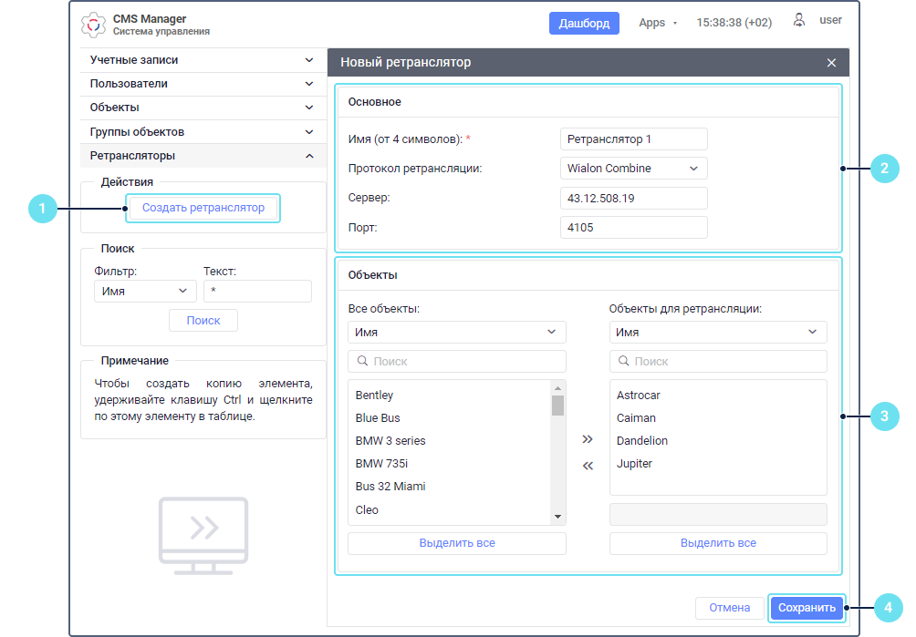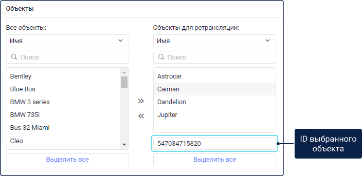 В этом блоке необходимо выбрать объекты для ретрансляции. Для этого в списке Все объекты выделите необходимые и перенесите их в список Объекты для ретрансляции с помощью иконки