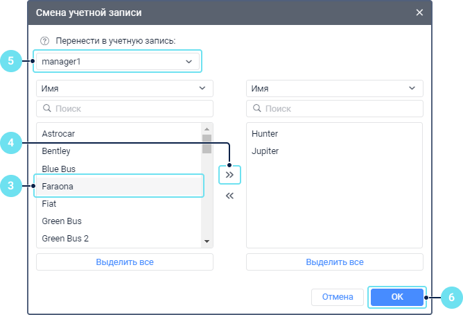 В левом списке выберите объекты, которые необходимо перенести в другую учетную запись. Для поиска нужного объекта можно воспользоваться динамическим фильтром над списком.