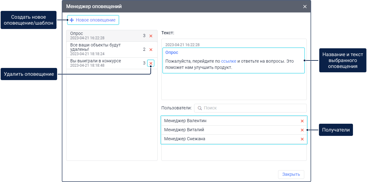 Чтобы открыть диалоговое окно Менеджер оповещений, нажмите на одноименную кнопку в навигационной панели слева.