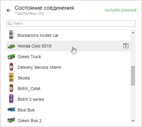 Чтобы увидеть перечень всех объектов, находящихся в геозоне, нажмите на ее имя. Над перечнем расположен динамический фильтр для поиска объектов по имени. Нажмите на строку с объектом, чтобы открыть его мини-окно.