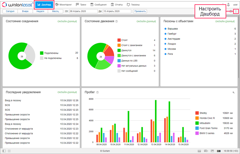 На вкладке Дашборд содержится сводная информация об объектах из рабочего списка. Здесь можно быстро оценить состояние соединения и движения объектов, увидеть геозоны с объектами, последние онлайн-уведомления и др. Информация обновляется по мере получения новых сообщений от объектов.
