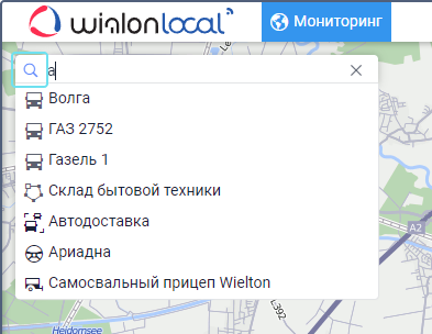 Нажмите на кнопку поиска на карте. В появившемся поле задайте фильтр поиска (введите символы из имени искомого элемента). Кроме того, если речь идет об объекте, то поиск может осуществляться по его уникальному ID, а также по регистрационному знаку или VIN-номеру, введенным на вкладке Характеристики свойств объекта. Во время ввода появляется список элементов, подходящих под ваш запрос. В списке поиска отображаются имена найденных элементов и пиктограммы, указывающие на их тип. Если введенному фильтру соответствует множество результатов, тогда список будет содержать по одному результату для каждого типа элементов.