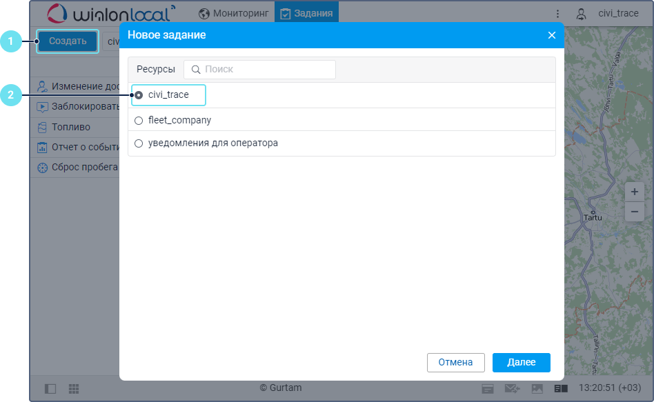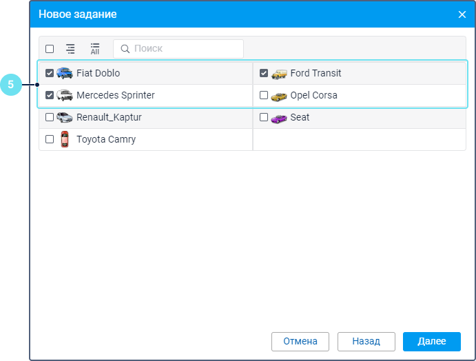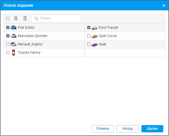 Чтобы выбрать объекты или группы, для которых необходимо создать задание, отметьте их в списке. Чтобы выбрать все элементы сразу, отметьте любой из них, удерживая клавишу Ctrl, или поставьте галочку в шапке таблицы.
