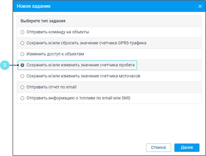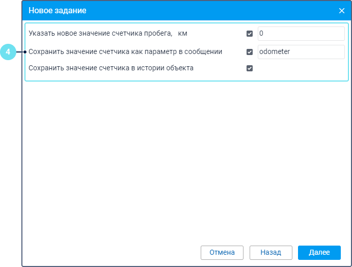 4. Установите параметры, которые зависят от выбранного типа задания и описаны в разделе Типы заданий. Для типа Отправить команду на объекты этот шаг выполняется после выбора объектов.