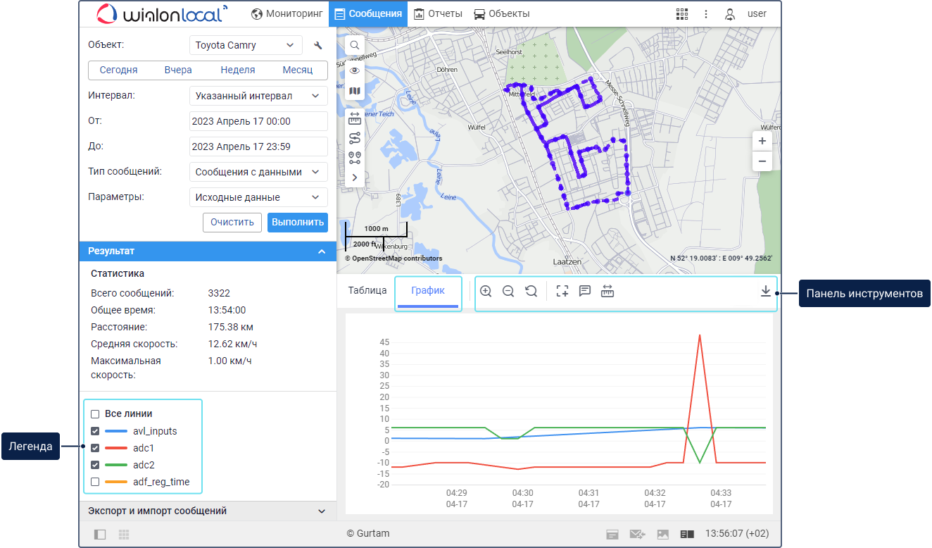 При переходе на другие вкладки положение карты и линии треков сохраняются. Чтобы очистить карту, можно отключить слой Сообщения или вернуться на одноименную вкладку и нажать на кнопку Очистить.