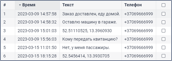 При запросе сообщений этого типа показывается таблица с SMS-сообщениями, которые объект отправил на сервер при выполнении команд, срабатывании тревожной кнопки и других случаях в зависимости от конфигурации устройства.