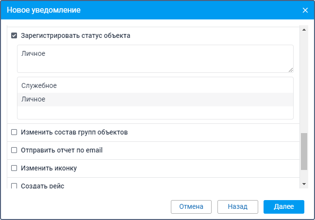 Этот способ действия позволяет зарегистрировать статус объекта: Личный или Служебный. Для этого необходимо право доступа Управление событиями на объект. Например, при входе в определенную геозону можно изменить статус объекта с личного на служебный или наоборот.