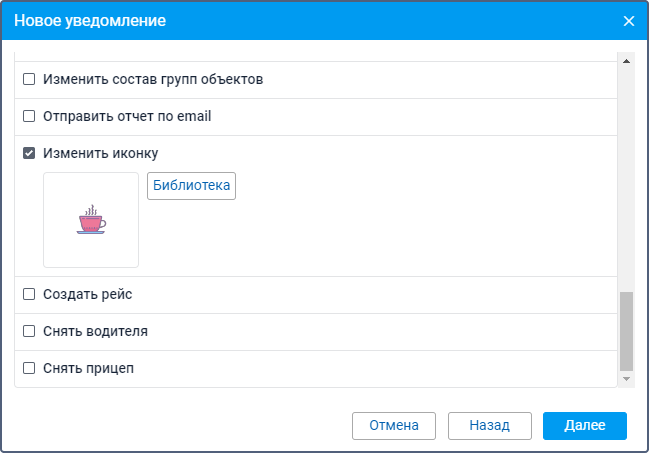 Этот способ действия позволяет выбрать иконку, которая должна быть иконкой объекта после срабатывания уведомления. Чтобы открыть список доступных иконок, нажмите на кнопку Библиотека.