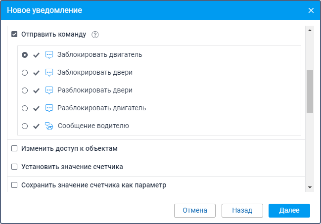 Этот способ действия позволяет отправить определенную команду на объект(ы). В списке содержатся все доступные команды, созданные в свойствах всех выбранных объектов, если на эти объекты есть право доступа Отправка команд. Слева от имени каждой команды могут показываться следующие иконки: