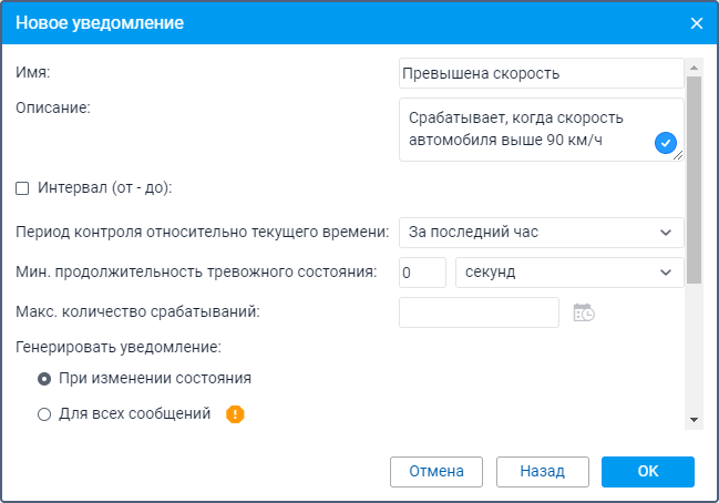 Минимальная продолжительность тревожного состояния* | Параметр, предназначенный для того, чтобы исключить случайное срабатывание уведомления из-за погрешностей трекера (например, при ложных выездах за пределы геозоны). Укажите минимальную продолжительность тревожного состояния в секундах, минутах или часах, выбрав единицу измерения в выпадающем списке. Максимальное допустимое значение — 24 часа (1440 минут, 86400 секунд). Этот параметр применяется ко всем условиям срабатывания уведомления сразу. Например, в уведомлении типа Геозона учитывается как длительность нахождения объекта внутри или вне геозоны, так и дополнительные настройки (скорость, значение датчика). |