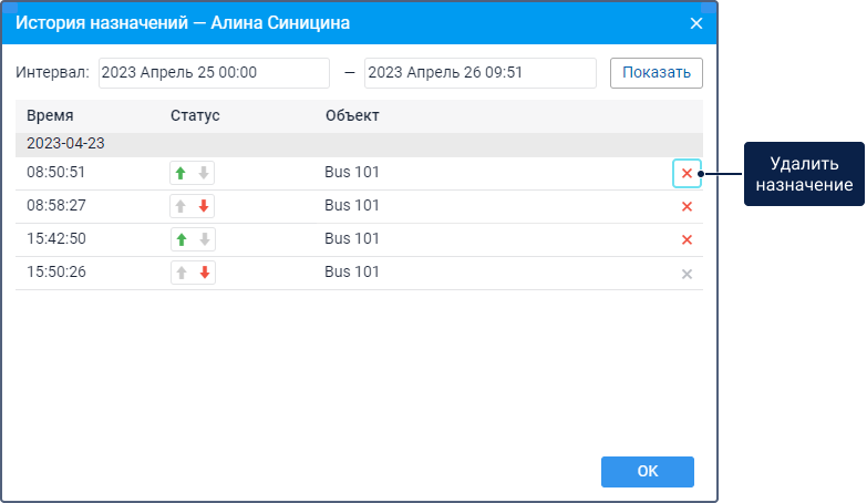 Для просмотра истории назначений укажите необходимый интервал и нажмите на кнопку Показать. В списке назначений показываются дата и время назначения или снятия пассажира с объекта, статус пассажира и имя объекта.