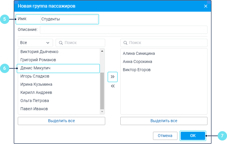 - Выберите пассажиров, которые должны входить в группу. Для этого в списке слева выделите необходимых и перенесите их в список справа с помощью иконки