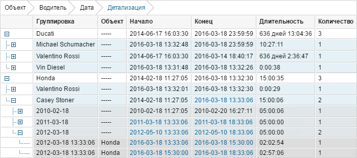 Отчет организован таким образом, что в первый столбец выводятся все объекты, на которые назначался выбранный водитель. Лучше всего применять к данному отчету функцию детализации, чтобы можно было развернуть любой объект и посмотреть более подробную информацию по нему.