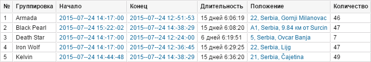 Ниже следует пример — таблица Стоянки для группы, состоящей из пяти объектов. Таблица дает следующие данные: начало первой стоянки, окончание последней стоянки, суммарная длительность всех стоянок, общее количество стоянок за отчетный интервал. При этом на каждый объект приходится одна строка таблицы.