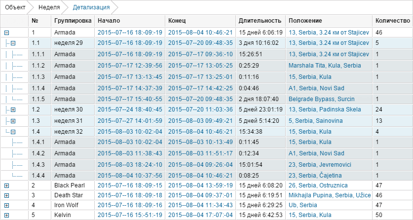 В придачу к детализации можно применить группировку данных — по годам/месяцам/неделям/дням/сменам. В таком случае информация в таблице будет сгруппирована по заданным временным интервалам. Если таковых интервалов несколько, то группировки будут распределены по уровням вложенности. Детализация при наличии группировок располагается на последнем уровне вложенности и по-прежнему предоставляет возможность просмотреть подробный перечень событий по данному объекту.
