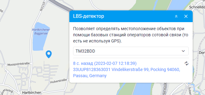 В окне LBS-детектора можно увидеть время, когда были получены данные о последнем местоположении, и его адрес. Также здесь доступна иконка