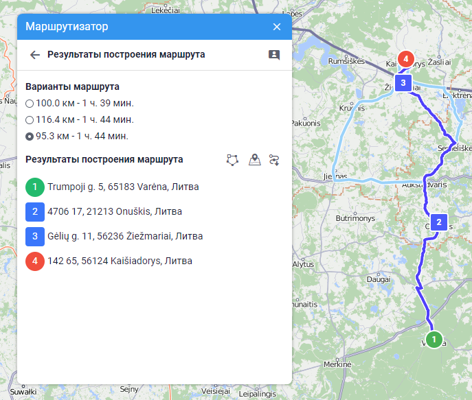 Если включена опция Альтернативные маршруты (доступна только при выборе источников маршрутизации Google, HERE, Sygic), то в разделе Варианты маршрута могут показываться несколько доступных вариантов с разным расстоянием и временем. Подходящий вариант можно выбрать как в самом разделе, так и на карте. На карте выбранный маршрут выделяется темно-синим цветом, а доступные альтернативные варианты — светло-синим.