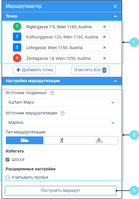 Укажите адреса обязательных точек маршрута и, если необходимо, добавьте любое количество промежуточных точек.