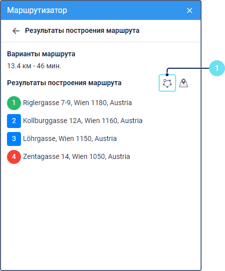 После этого на карте показывается маршрут, построенный в соответствии с добавленными точками и указанными настройками. Чтобы изменить точки или настройки и построить маршрут заново, нажмите на иконку