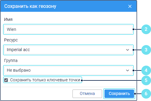 - если она включена, то сохраненная геозона представляет собой геозону-линию, которая проходит по наикратчайшей траектории через контрольные точки маршрута без учета дорог и указанных настроек маршрутизации;