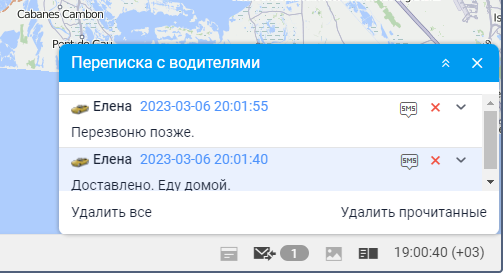 Отправленные водителем сообщения показываются в журнале и в окне Переписка с водителями, так же как и команды, отправленные с оборудования. В этом окне можно ответить на сообщения водителя, нажав на иконку .