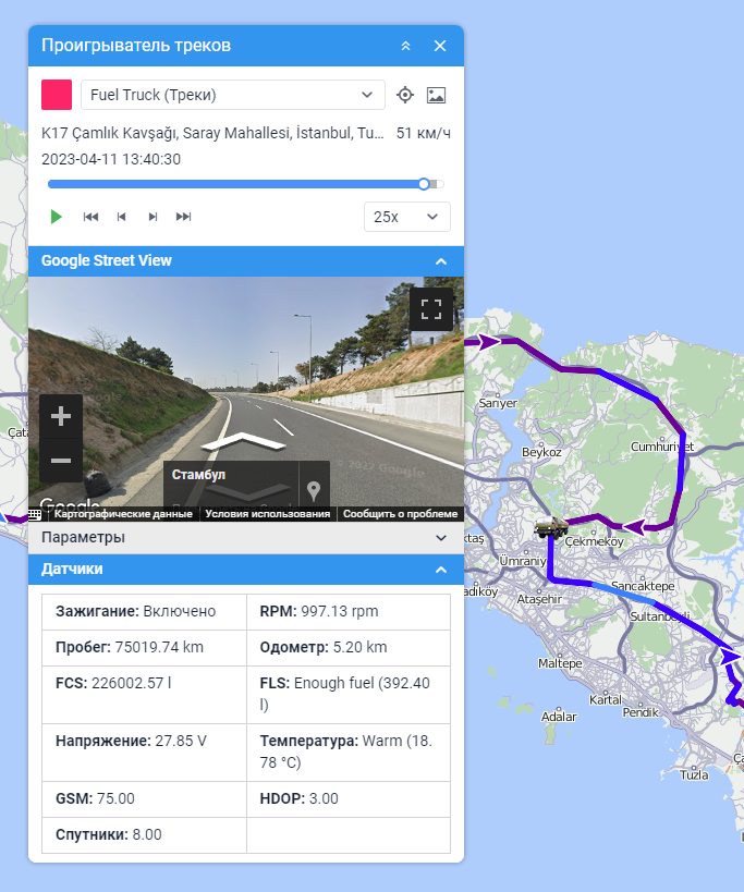 Во время проигрывания под именем объекта показываются адрес и скорость для каждого сообщения, а над временнóй шкалой — дата и время. Кроме того, при наличии ключей Google или Yandex можно отслеживать движение объектов по настоящим улицам. Для этого необходимо развернуть секции Google Street View или Yandex Panorama, расположенные ниже.