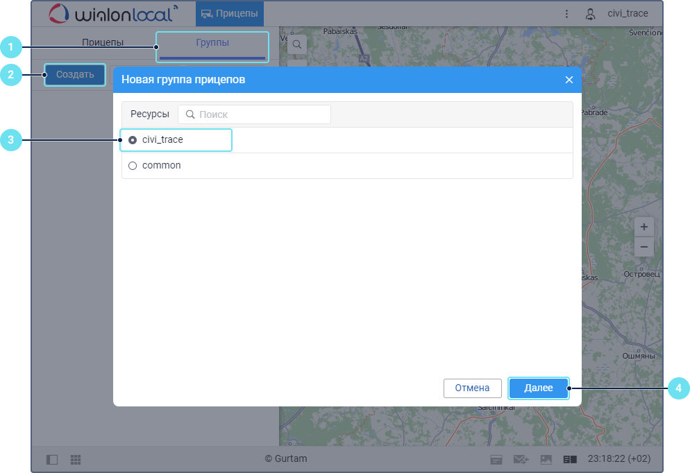 Выберите ресурс, в котором необходимо создать группу прицепов.