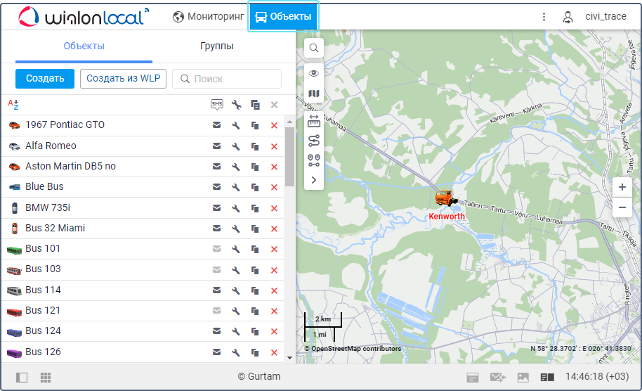 На вкладке Объекты создаются объекты и группы объектов, за которыми впоследствии можно следить на вкладке Мониторинг. На вкладке работает динамический поиск по имени объекта. Также здесь можно выполнять следующие действия с объектами: отправка SMS, редактирование свойств, копирование и удаление.