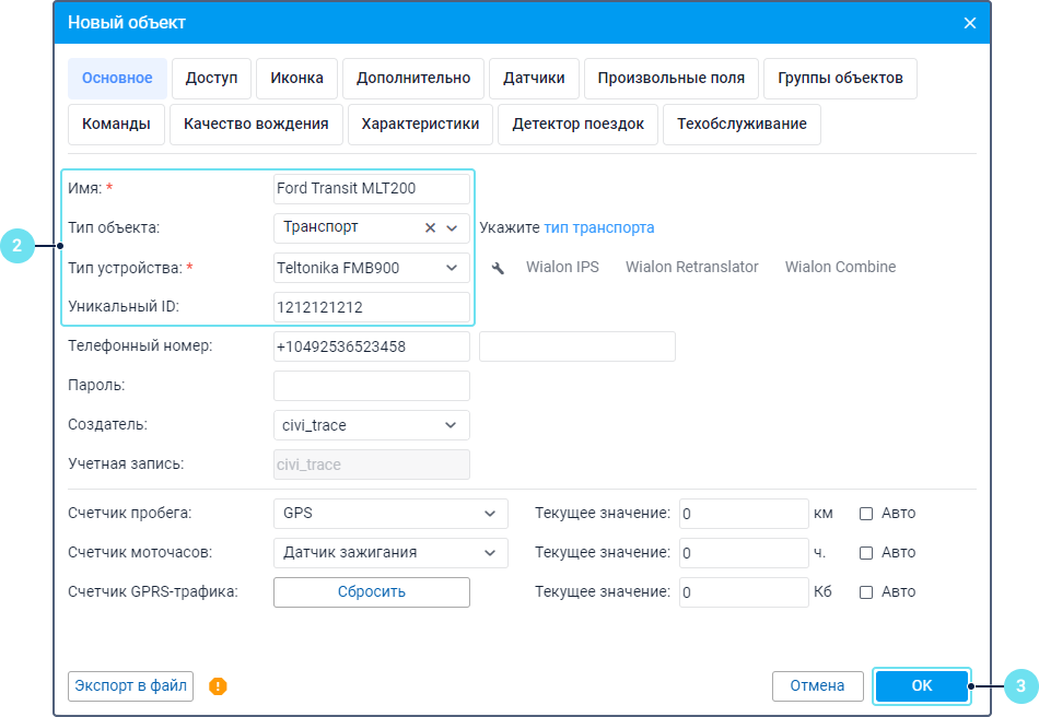 Укажите свойства объекта. Для подключения объекта к системе необходимо заполнить как минимум следующие поля на вкладке Основное: