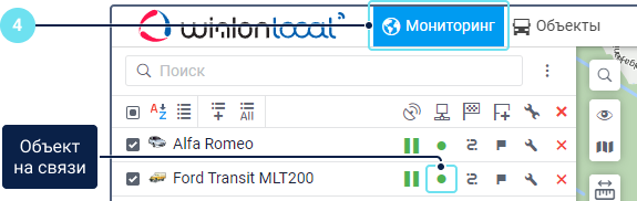 Перейдите на вкладку Мониторинг, куда автоматически добавляются созданные объекты. Удостоверьтесь, что объект подключен и отправляет сообщения в систему. В этом случае в списке в столбце Состояние соединения для него показывается зеленый маркер.