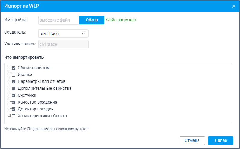 Если у вас есть файл WLP с сохраненными свойствами объекта, то вы можете создать объект с ужé настроенными свойствами. Для этого нажмите на кнопку Создать из WLP, выберите файл и параметры, которые вы хотите добавить в свойства объекта, и нажмите Далее.