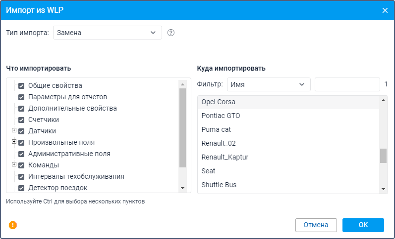 С помощью кнопки Экспорт в файл вы можете сохранить выбранные данные из свойств объекта в отдельный файл формата WLP. См. подробное описание этой функции на странице Экспорт в WLP.