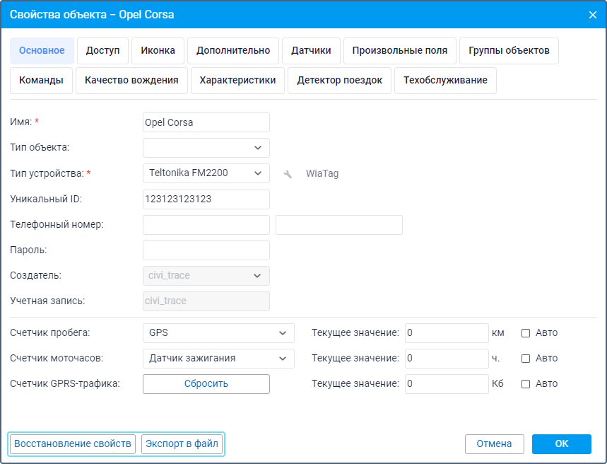 Кнопки для восстановления и экспорта свойств объекта расположены в нижней части вкладки Основное.