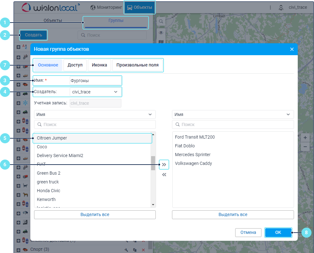 Выберите необходимую группу в списке, чтобы на карте увидеть местоположение всех ее объектов, которые находятся на связи.